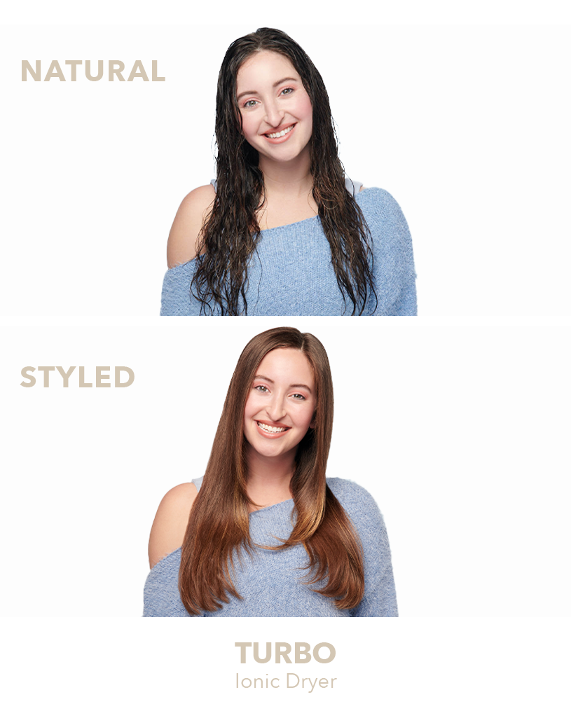 No more dreading the dryer. The TURBO Ionic Dryer is a breakthrough in hair dryer technology that dries hair up to 2X faster and retains moisture for smooth, healthy, shiny hair. The efficient High-Power DC Motor and Turbine Fan design are uniquely combined to deliver the lightest and most powerful dryer for easier drying days ahead! Customize heat, power, and ion levels to create perfect results for your unique hair needs and personalized style.