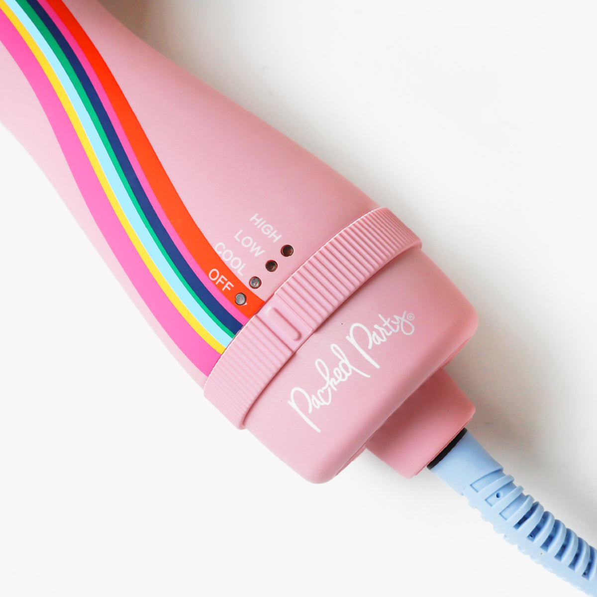 The best date to every one of life’s parties is the perfect blowout! Getting smoother, straighter, sleeker hair has never been easier with this amazing pink Packed Party Heated Aluminum Barrel Hot Air Brush. This lightweight and easy to use dryer brush allows you to blow dry and style your hair all at once! Easily pick from three heat settings to get the perfect temperature, and say goodbye to knots with tangle-free bristles. If this rainbow pink design isn't fun enough, the bright blue cord is guaranteed to liven up your countertop. When you need party ready hair trust us when we say you can count on this blow dry brush to have your back.