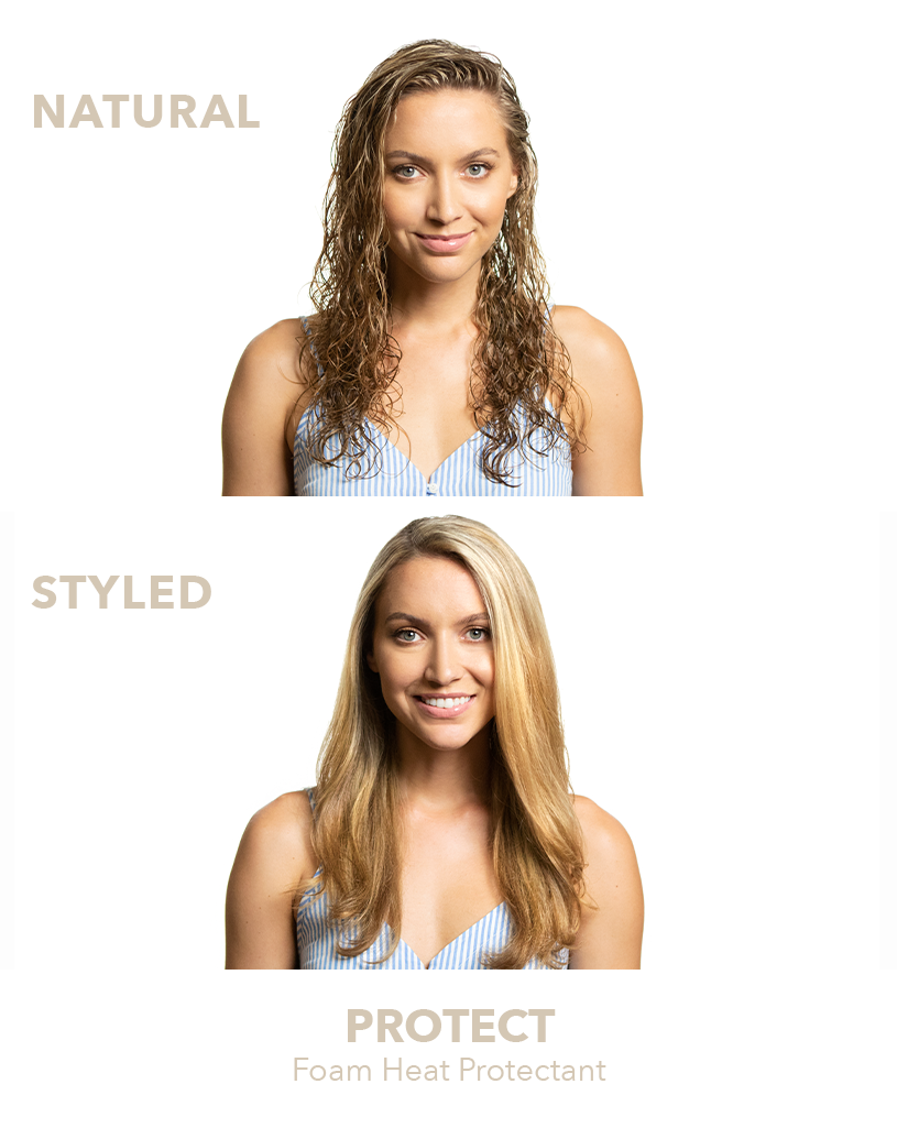 PROTECT Foam Heat Protectant uses Baobab, nature’s powerhouse ingredient, to create the ultimate anti-aging shield for your hair. Add two pumps to your hand then add to damp or dry hair and style protected up to 450ºF.
